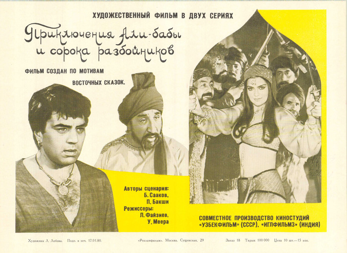 Дармендра (Али-Баба), X. Малини (Марджина), Р. Быков (правитель Гульабада и Абу-Хасан), Мухамеджанов (отец Али-Бабы), С. Чиаурели (Замира, мать Али-Бабы), Я. Ахмедов (Касым, брат Али-Бабы), З. Аман (Фатима), Ходжадурды Нарлиев (Хамид), Ф. Мкртчян (Мустафа), X. Умаров (Ахмед-Сорвиголова), Д. Хамраев (Мухамед, метатель ножей), Е. Санаева (Дух пещеры Сим-сим), М. Пури (отец Фатимы), П. Чопра (Раджа), П. Капур (Раджа-самозванец), Р. Ананд (доктор), С. Диванов, К. Абдураимов (друзья Али- Бабы); В. Абдуллаев, Б. Алиев, И. Адылов, М. Атабаев, Ф. Аминов, Я. Файзуллаев, Ш. Кабулов, А. Кенжаев, М. Мохан, М. Мансуров, Т. Мелеев, X. Мирхидаев, П. Тимофеев, Б. Ихтияров, Р. Тураев, Д. Хашимов, Ф. Хайдаров, М. Холматов, Г. Коломпар. Каскадеры: У. Кудайбергенов, С. Диканбаев, В. Бачурин, Т. Танин, О. Бурибаев, М. Тишабаев в ролях