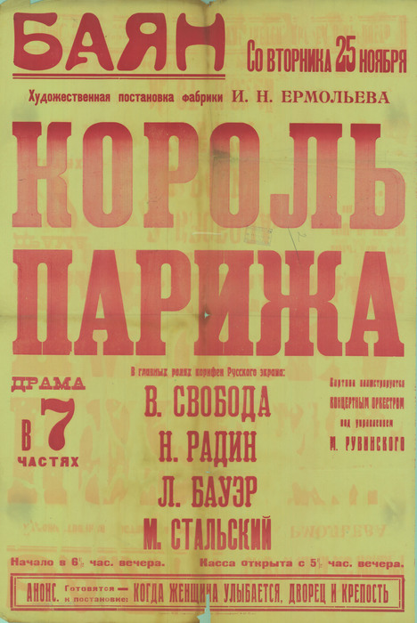 По одноименному роману Жоржа Оне.Последний фильм Евгения Бауэра.Картину после его смерти закончила Ольга Рахманова. Два авантюриста-карточника «король Парижа» Роджер и его приятель Равель Венков попадают в дом овдовевшей графини Дьернштейн.Графиня влюбляется в Роджера.Авантюристы решают воспользоваться этим,чтобы завладеть ее богатством.На их пути встает сын графини,скульптор Жан.Венков с группой бандитов пытается убрать Жана,но подоспевший друг скульптора спасает его.Выстрелом из пистолета он убивает Венкова.Через некоторое время происходит ссора Роджера с Жаном и на дуэли сын графини убивает «короля Парижа». 1.Глубинное многофигурное кадрирование определяет стиль фильма.Оно иногда сочетается с монтажом и кр.планами.В сцене «В игорном доме»:Венков на первом плане следит за игрой Роджера,стол с игроками в глубине кадра.В другой сцене здесь же Венков и Роджер на первом плане около колонны обсуждают,как выиграть,в глубине кадра стол с игроками.В сцене «Бал»:герцогиня на балконе на первом плане,внизу в глубине множество гостей,среди которых Роджер и Венков.В этой же сцене есть еще один глубинный кадр,где герцогиня на первом плане,а в глубине гости и Роджер.Сцена в парке:ссора Роджера с герцогиней и увлечение его другой женщиной.На первом плане,на фоне памятника,Роджер и герцогиня.За ними в глубине развлекаются гости.Оттуда подходит другая женщина и Роджер уходит с ней.Глубинный кадр «ревности» в салоне:на первом плане Роджер с женщиной под кипарисами,за ними из глубины кадра герцогиня ревниво следит за ними. 2. Монтаж и крупный план:в 1 сцене в игорном доме Венков замечает шулерство Роджера,следует крупный план его рук с картами под столом.Очень крупный план лица герцогини стоящей на болконе в сцене «Бал».Крупный план страдающей герцогини,когда Роджер ее покидает и уходит с другой женщиной(на фоне памятника).Монтаж крупных планов лиц герцогини и ее сына в сцене их ссоры